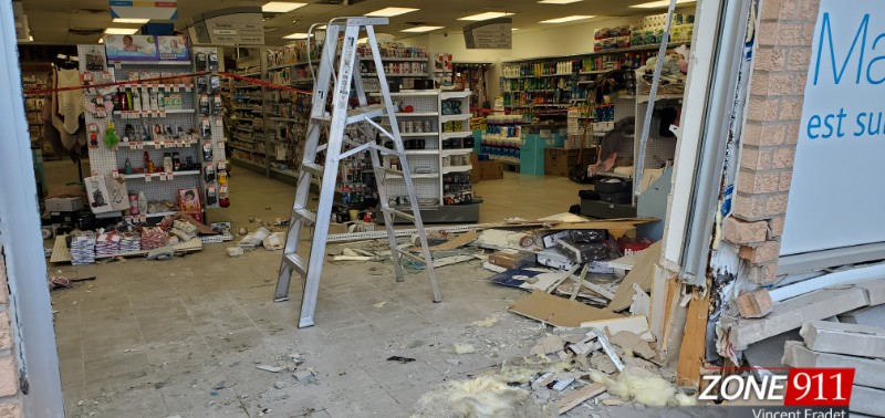 Pour une raison inconnue, le conducteur d'un certain âge, possiblement un septuagénaire ou octogénaire, a perdu le contrôle dans le stationnement. Son véhicule s'est retrouvé en partie encastré dans le commerce. Divers items et présentoires ont été projetés.