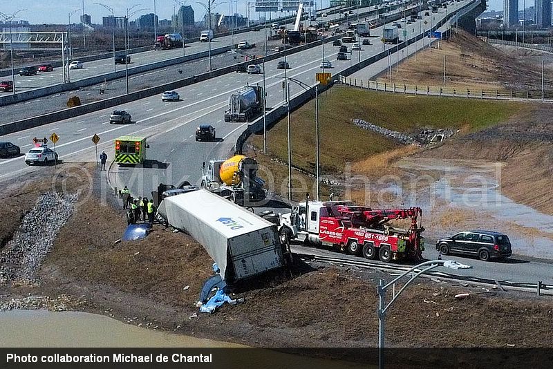 Cet après-midi, à Brossard, un camion semi-remorque s'est renversé dans la courbe de la bretelle de l'autoroute 15 pour le pont Samuel-De-Champlain (autoroute 10 Nord)