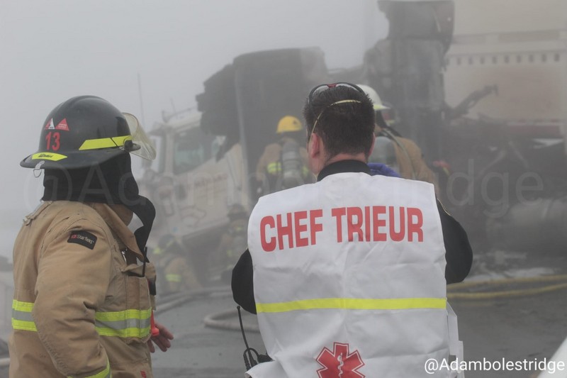 Ce matin, à St-Dominique près de St-Hyaciathe, 4 camions lourds et une voiture ont été impliqués dans une série de collision successive.