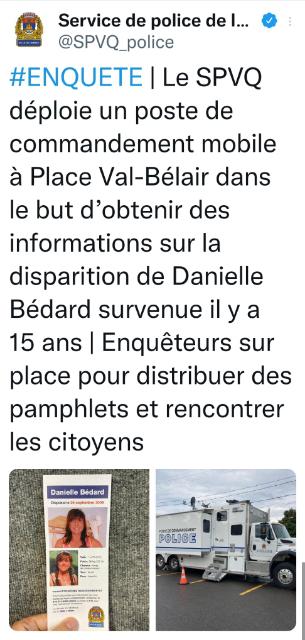 Le Service de police de la Ville de Québec (SPVQ) est toujours actif dans l’enquête sur la disparition de Danielle Bédard et il déploie aujourd’hui un poste de commandement mobile à la Place Val-Bélair, située au 1 065, boulevard Pie-XI Nord.