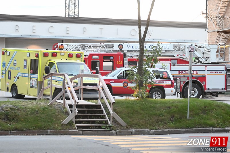 Les pompiers, policiers, paramédics assistés des spécialistes en explosif de la Sûreté du Québec, sont en intervention pour la récupération d'un produit dangereux dans une section des laboratoires du centre hospitalier de l'Enfant-Jésus.