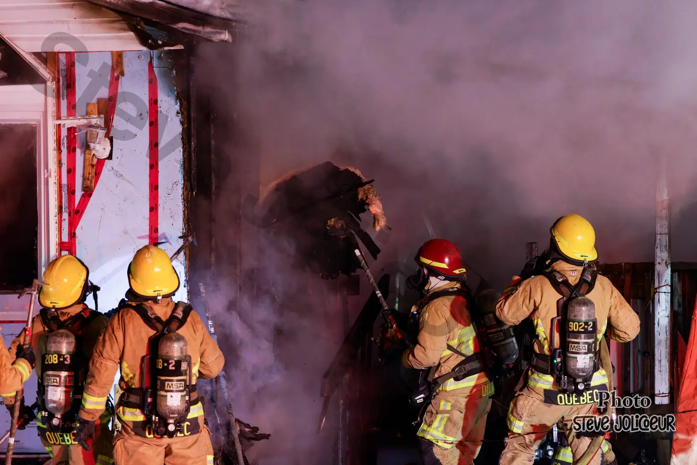 La toiture s'est effondrée sous la force du brasier. La résidence sera probablement une perte totale. Selon des citoyens, il y avait un chien à l'intérieur, on ignore s'il a été sauvé.
