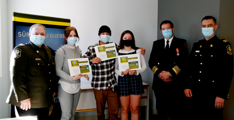 La Sûreté du Québec et le Service incendie de Château-Richer ont souhaité souligner l’intervention de mesdames Drouin et Fortin et de messieurs Lewis et Denault. Ceux-ci ne se sont pas contentés d’appeler les secours, mais ils sont intervenus directement pour alerter les résidents et s’assurer que tous soient en sécurité. Pour cette raison, le 2 juin en avant-midi, une remise de certificats de collaboration a eu lieu au poste de la Sûreté du Québec de la MRC de la Côte-de-Beaupré.